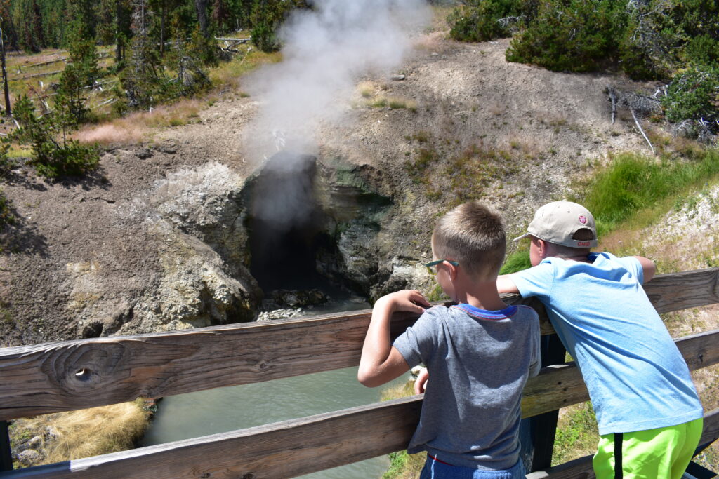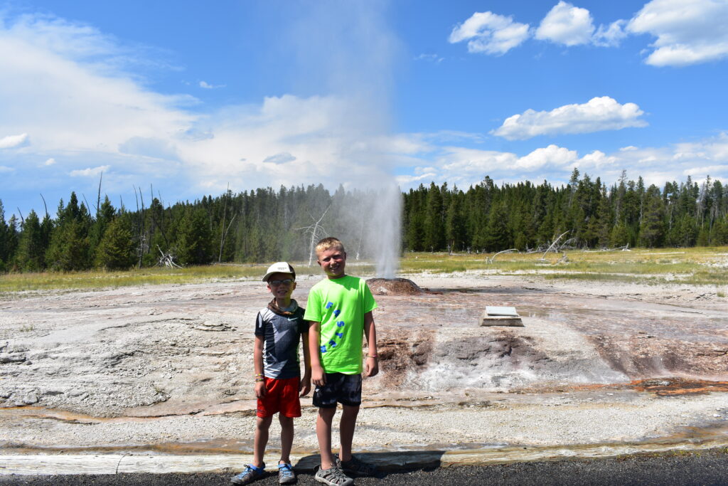 After that, we drove north to the Firehole Drive, which is a one-way street, not marked, just a few miles away. Side note – you would be wise to print directions and write landmarks before you go. I would write things like ‘5 miles north of X’ and it helped. The drive was really pretty and there were only a handful of cars. You could just pull off to side and take some pics of some really cool thermal features. It was a good time of day to do this because my kids were tired. So they could stay in car while I walked 10 feet away to see the various items. They did get out for Pink Cone Geyser and loved it. It basically was erupting constantly, you could stand right by it and get wet. They loved it.
