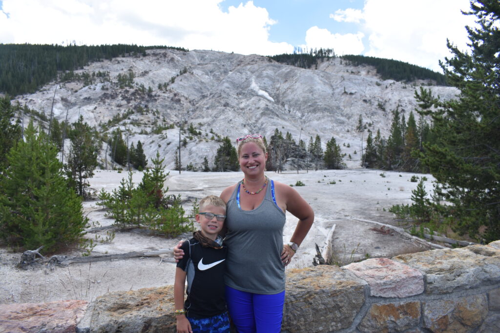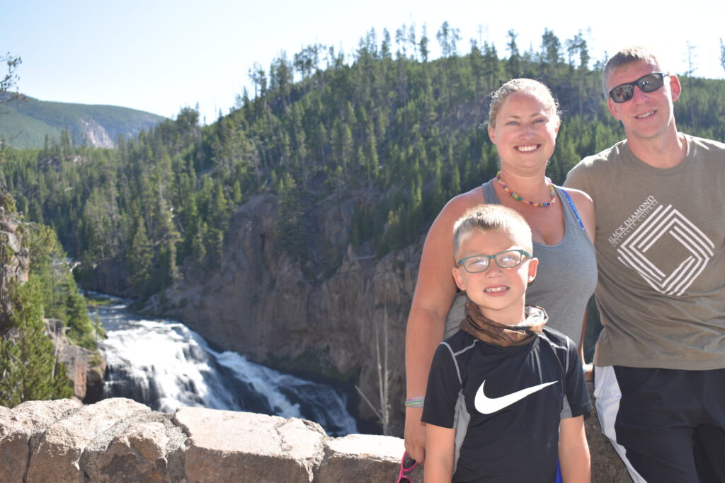 Next we started driving towards Gibbon Falls. We had some extra time to burn today because we were staying in Mammoth and couldn’t check in until 4 (ended up getting in early at 3!) so we made a few stops. We stopped at a Terrace Spring with just a few thermal features. We also stopped to use the restroom and have a snack at the Gibbon Picnic area which had a great view of the river. The kids actually really liked this area and headed down to the river to throw some more rocks.