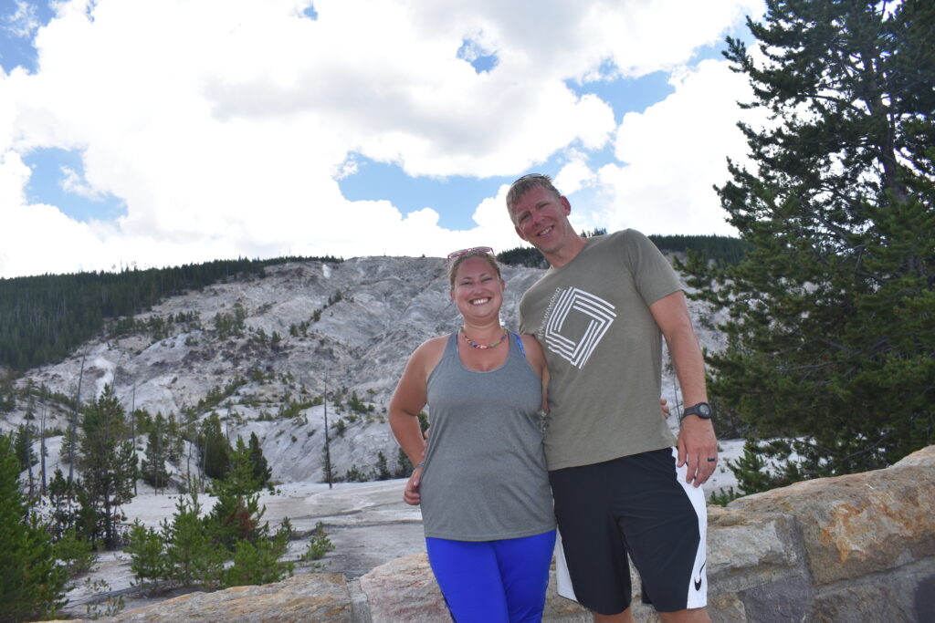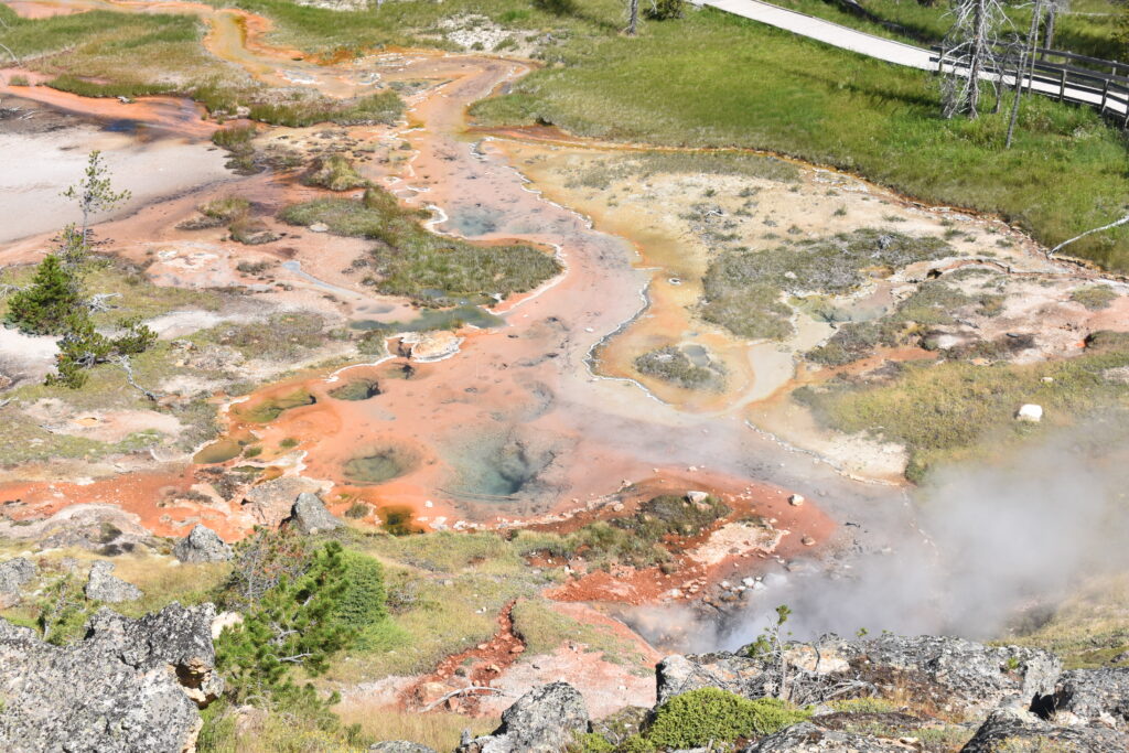 After lunch we headed back south to the Fairy Falls trailhead. We enjoyed watching the enormous amount of traffic pulling into Grand Prismatic Spring, and even though their views are better, they had to walk a mile. We instead pulled into the Fairy Falls area but couldn’t find a spot and did end up on road, but not too bad. We walked to the overlook of Grand Prismatic, which was about 0.8 miles (1.6 miles round trip). The trail was flat for a while then on the way to the overlook was pretty steep, but the view was amazing!! I was happy we did this trail to get the full picture of Grand Prismatic, and missed the crowds. It would not be worth it if it was still steamy. So, try to look around at the thermal features before you go, and if there’s still tons of steam, you can’t see it.