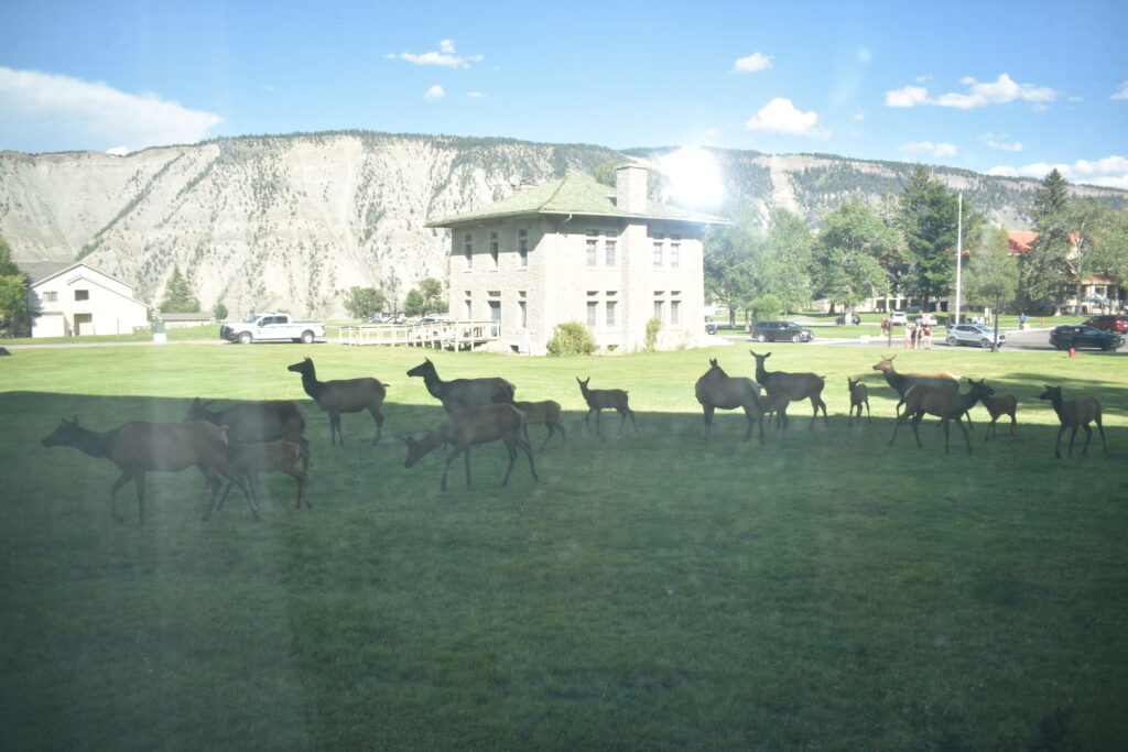 We checked into Mammoth Hotel around 3 and our room was really nice, it’s a beautiful hotel. It doesn’t get that great of reviews on some of the websites but I have no idea why. It was gorgeous, had nice beds and furniture, a huge, beautiful bathroom. Also has a wonderful green space out front and it’s very walkable. No AC (we were there in July and room was about 78, but we opened windows) and no microwave but other than that it was perfect. The other amazing thing – there are Elk EVERYWHERE. We spent so much time just watching out our window or watching them in the grass out front (from a safe distance!). At one point 17 ran right in front of our window, we were freaking out. Anyway, it’s just a great place. We ended up getting pizza from a place in Gardiner which was good and only a 10 minute drive or so.