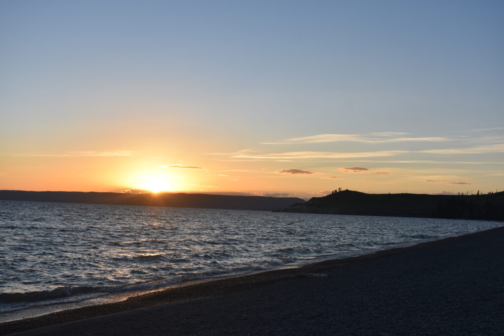 We ate takeout at the grill near the lake and it was pretty good. Ate outside on picnic tables with a view. We then took off towards the Lake Butte Overlook for sunset but got stopped by a crowd of people checking out a grizzly and it’s cub! It was down in a valley off the road but close enough we could see without binoculars! We watched her for maybe 20 minutes then drove up to the overlook. I was thrilled for an overlook I didn’t have to hike to 🙂 and it had great views. We didn’t stay until sunset because the kids didn’t really care about the view, so we instead headed back down the hill and stopped at a beach on the lake and let them, THROW ROCKS while we watched the sunset. It was great. Very chilly though!