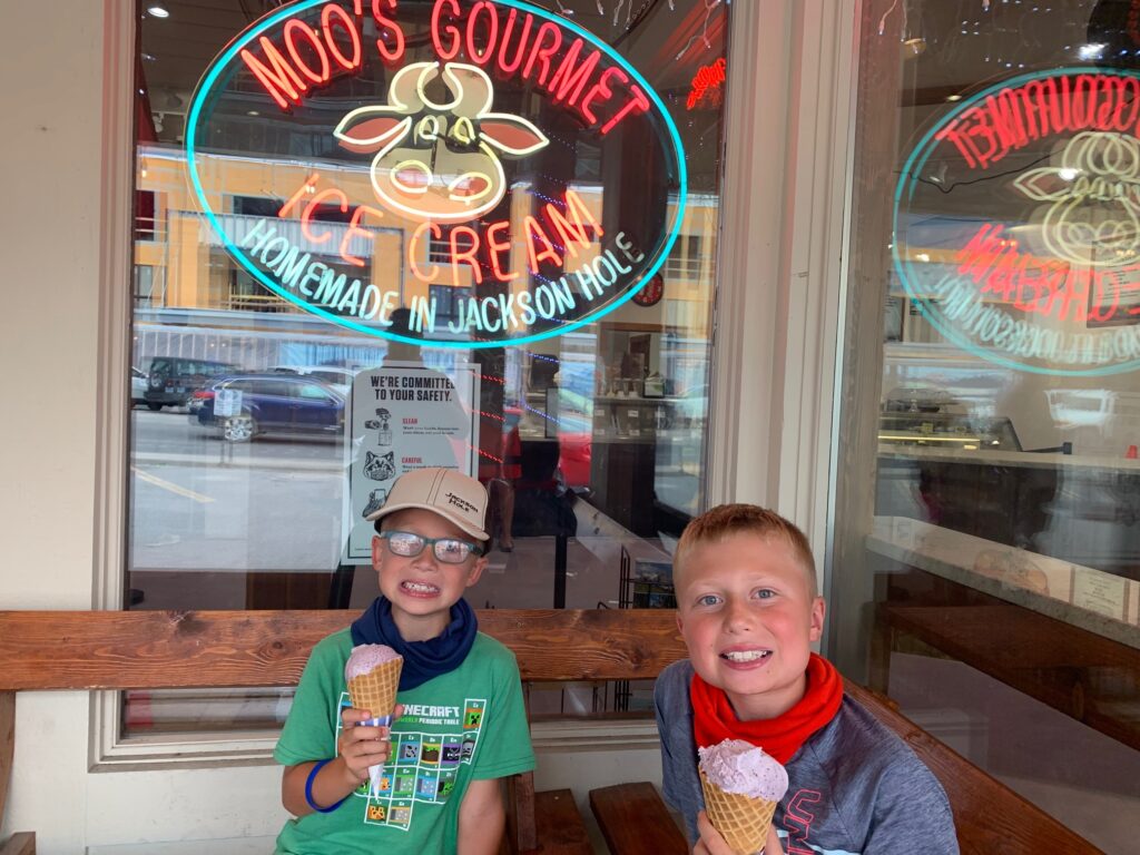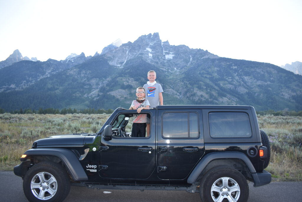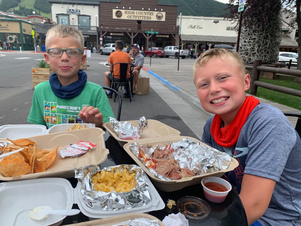 We drove in from Idaho Falls, which was only about a 2 hour, beautiful drive. There were lots of beautiful pull off spots on the way into Jackson with views of the mountains. We didn’t stop at many because we had hoped to check in early. We even saw a lot of ‘check your breaks’ signs and ‘runaway truck ramps’ which were scary 🙂 As we pulled into town we stopped to eat our packed PBJ at some picnic tables at the first gas station we saw. Turns out they also serve some good pulled pork sandwiches which we purchased so we were not just stealing their tables. The gas station actually is a wonderful store with wine and other things to purchase.