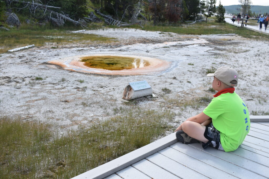 Next we drove to Old Faithful, and checked the geyser prediction times and it was set to go off at 9:40. So we grabbed a snack, used this opportunity to go into the nice restrooms (yay!) and found a spot to wait. Eruption was cool and the kids were impressed, but it was not my favorite attraction of the day. Just too crowded honestly. After that, we took off to walk around the geysers. We had planned to walk the loop all the way to morning glory pool and back, but we found that the Grand Geyser was set to go off at a time that made it tricky to get back to. So we didn’t quite make it that far. We saw nearly every other geyser though and the kids really enjoyed reading all the names of each of them. The boardwalks around Upper Geyser Basin were really nice and made for a fun walk. It took us maybe 2 hours to walk them all. We have hundreds of pictures of the various geysers and hot springs – here are a few!