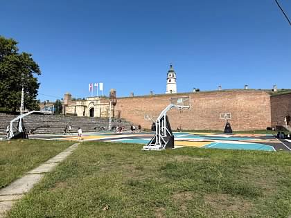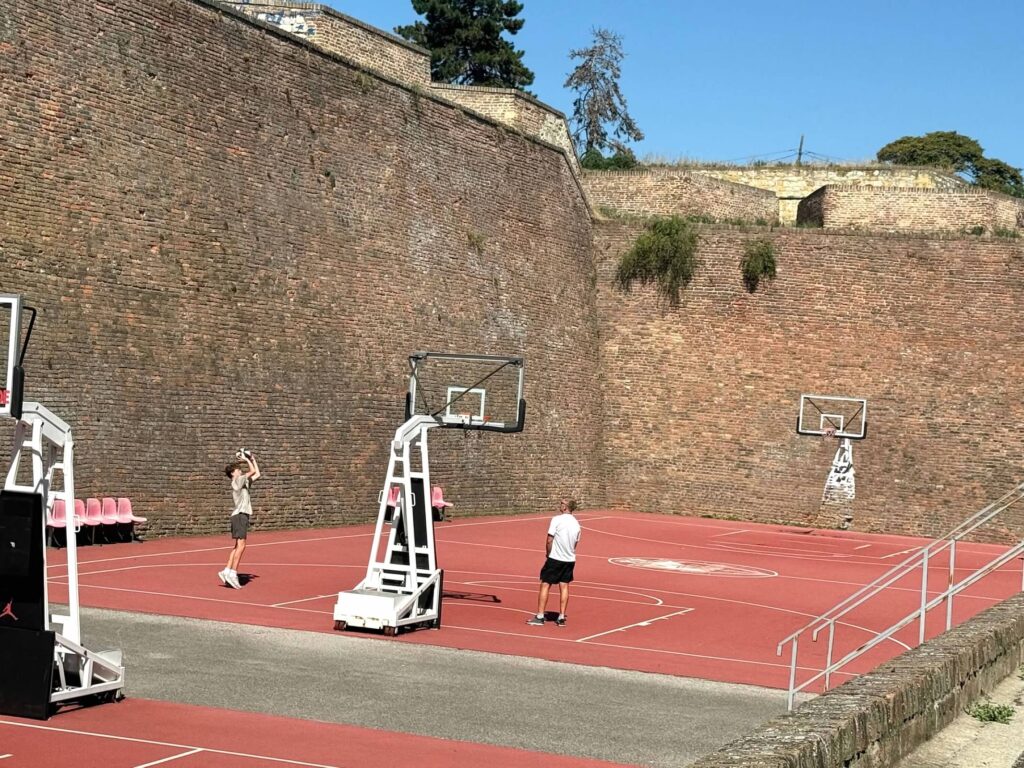 Just past the main pedestrian street is a huge park with a ton of activities to do, and we planned to spend most of the morning here. There are playgrounds, green spaces, views of the city and more. Our first stop was a basketball court, of course! This one was especially unique because it was built right next to the old fort. Might have been one of the most unique basketball courts we’ve been to yet. It was also so crowded! It was fun to see all of the courts being used for different teams practicing – little kids, high school and even some adult teams. While we tried to find a place to play, we ran into the man who looked to be in charge of the courts – and after fumbling around with google translate, we think we learned that you have to pay to rent the court? Either way, we gave him about $10 and went on our way to use it. There was also a super old stadium that we sat at to watch – very neat experience.